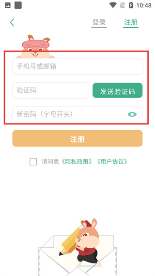 2、切换至注册界面后,需依次填写【手机号或邮箱】、获取【验证码】、设置【新密码】,完成后可点击【注册】按钮。
