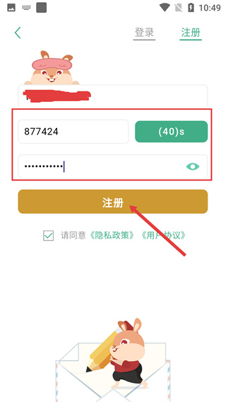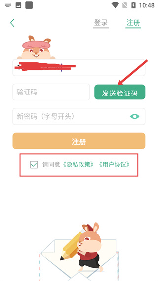 3、填写注册信息时,先填好账号栏,再点击【发送验证码】获取验证信息,同时要勾选【请同意-隐私政策-用户协议】的选项。