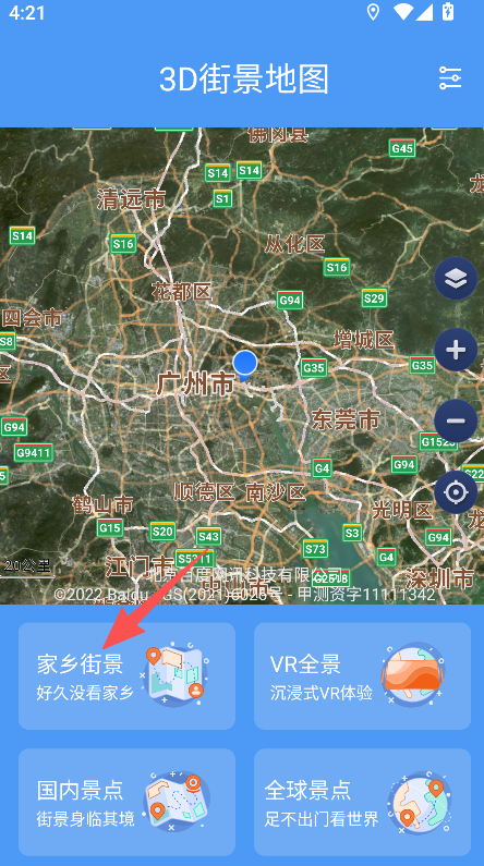 1、打开软件进入3D街景地图页面,点击家乡街景选项。