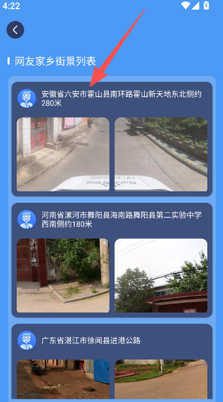 1、提供家乡街景查看功能,展示网友家乡街景列表,可选择对应条目查看具体地点的实地街景场景。