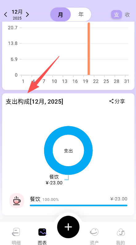 2、通过明细、图表、资产等板块分类呈现数据,让收支及资产信息的查看更直观且便捷高效。