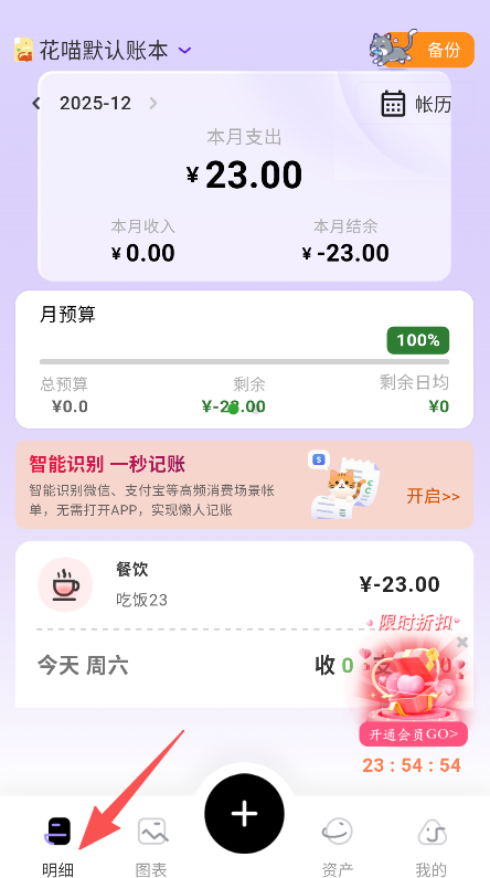 1、打开软件进入明细页面,点击加号添加收支记录。