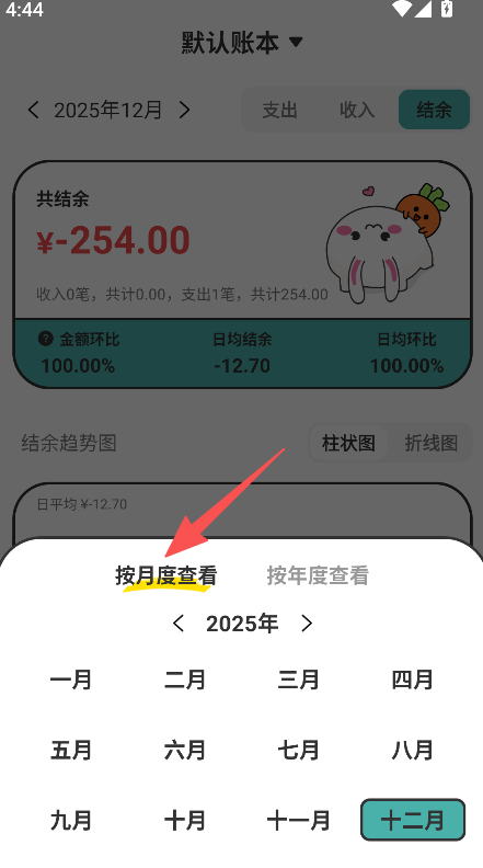 2、提供按月度年度查看数据的选项,适配不同周期的记账统计需求,便于回溯不同时段的资金变动情况。