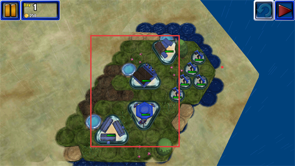 2、进入关卡后,先占领己方区域的建筑(如蓝色设施),获取资源与兵力支援,稳固初始阵地。