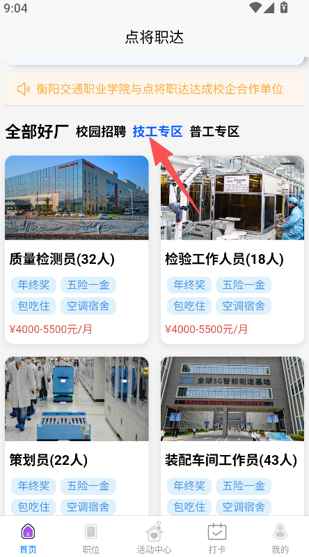 1、与院校达成校企合作,划分技工专区等岗位板块,覆盖不同类型岗位需求,适配多样求职场景及岗位选择需求。
