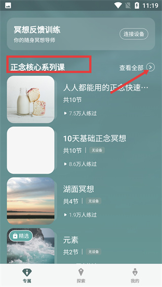1、进入冥想反馈训练界面,找到【正念核心系列课】板块,点击其右侧的【查看全部】,可浏览该系列的完整课程列表。