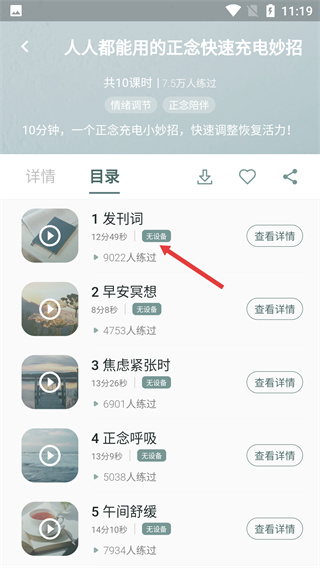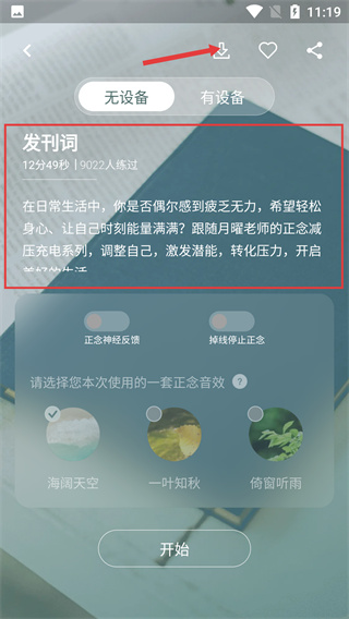 4、进入【发刊词】学习界面,先选【无设备】模式,再选定正念音效,确认设置后点击【下载】按钮开启下载课程操作。