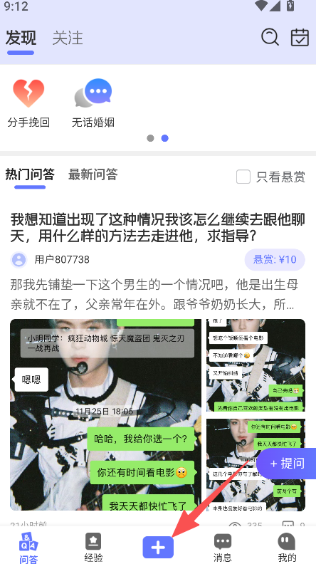 1、打开软件进入发现板块,浏览分手挽回等分类下的热门问答或最新问答内容。