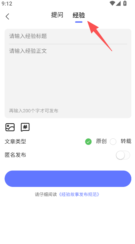 2、提供提问、经验板块切换功能,可输入经验标题与正文,选择文章类型完成内容发布。