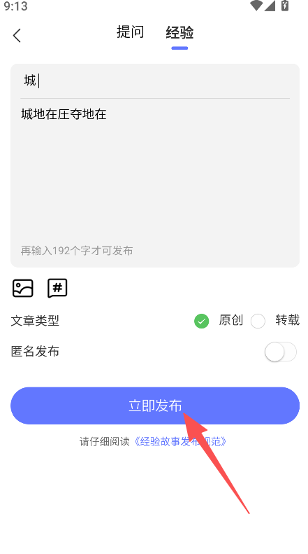 3、输入经验标题与正文,选择文章类型后点击立即发布完成操作。
