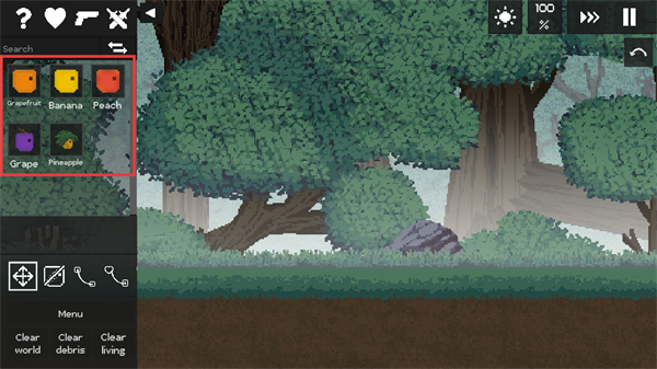 2、左侧道具栏选择水果,将其放置到场景中,作为互动元素。