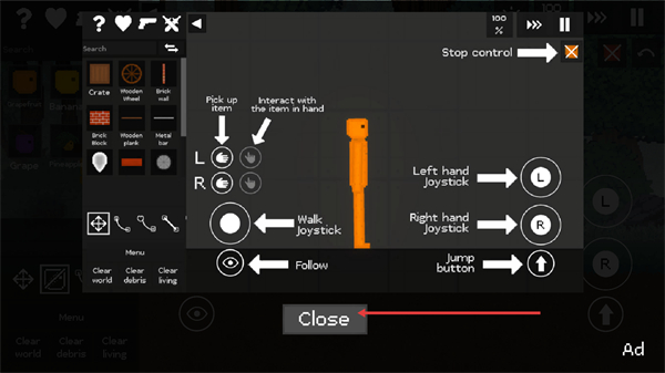 2、打开角色控制界面后,查看操作说明,点击【close】关闭界面,开始操控角色。