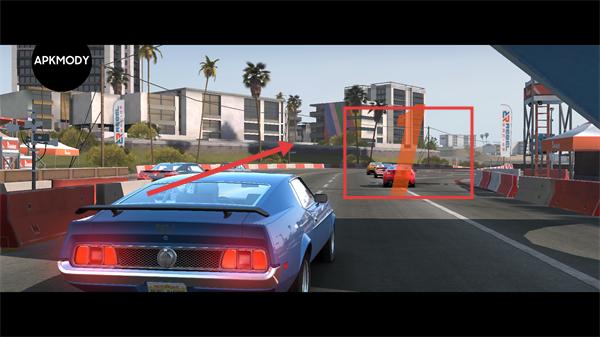 2、竞赛中锁定【红框内的敌方车辆】,操控赛车调整路线,向目标车辆靠近以提升排名。