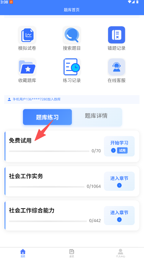 1、题库练习与模拟考试功能,支持按章节进行练习、参与限时模拟考试或进行真题测试。