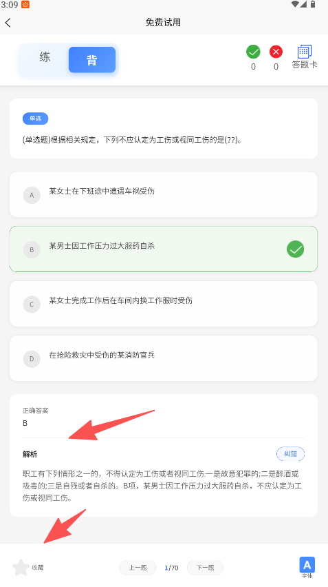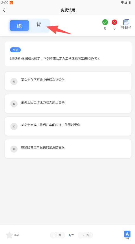 2、进入免费试用页面后在“背”题模式下查看题干与选项。
