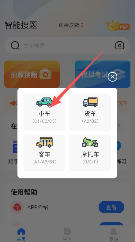 1、提供车型选择功能,分小车、货车等类别,进入对应车型的学法减分题库。