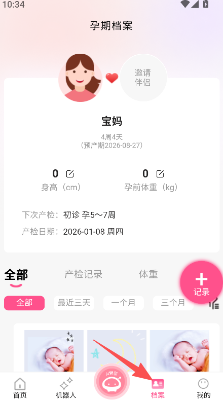 1、孕期档案整合核心信息,直观展示孕周等内容,便于快速了解孕期基础状态与产检安排。