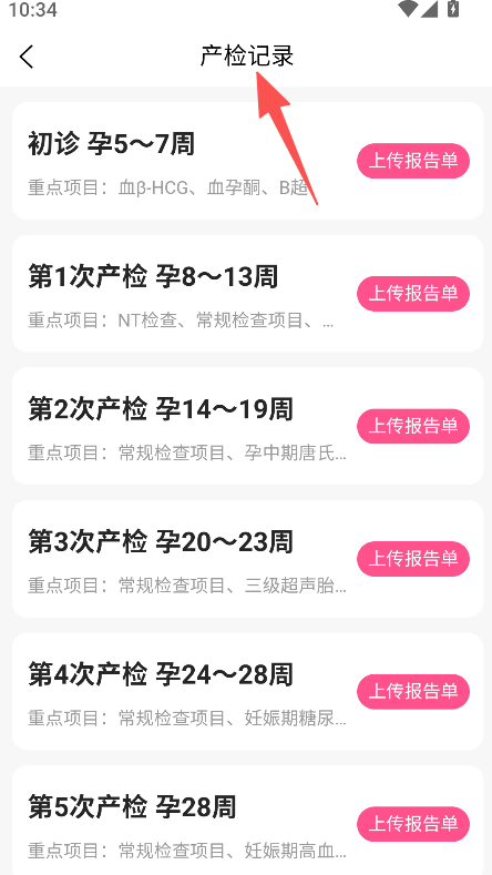 2、呈现分孕周的产检记录,明确各阶段重点项目,支持对应阶段的报告单上传操作。