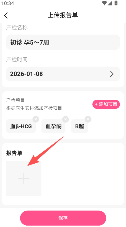 3、支持在上传报告单页面添加产检项目、上传报告,完成后点击保存以记录产检信息。
