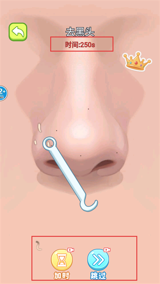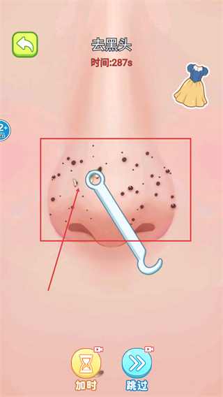 3、清理部分黑头后,可使用【加时】功能延长时间,或用【跳过】按钮快速推进关卡进程,注意剩余的时间限制。
