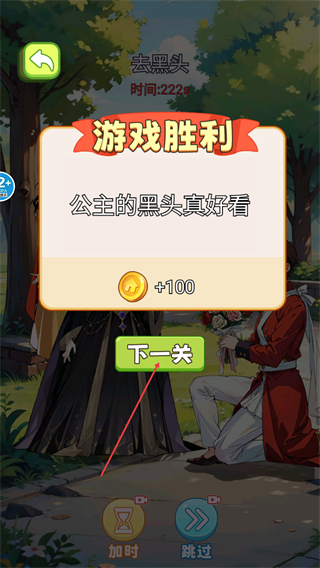 4、完成黑头清理后会显示游戏胜利,点击【下一关】按钮可继续挑战并获取【100】金币奖励。