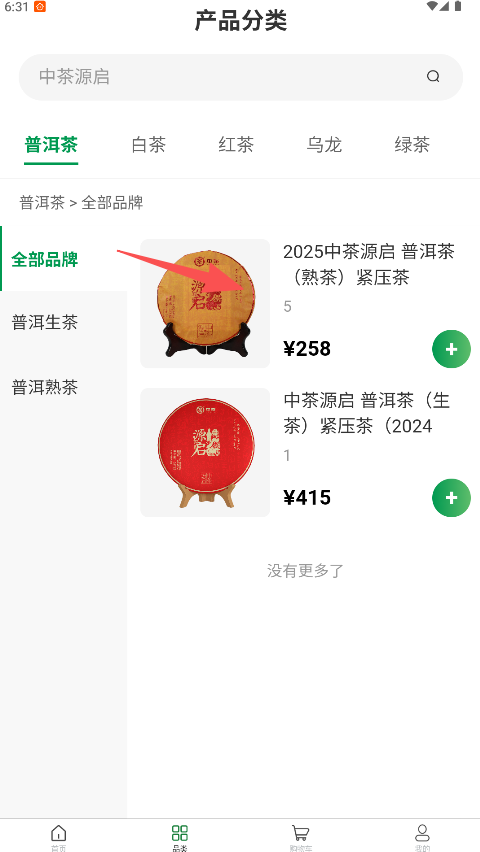 2、在普洱品类进入“产品分类”页查看选择具体商品。