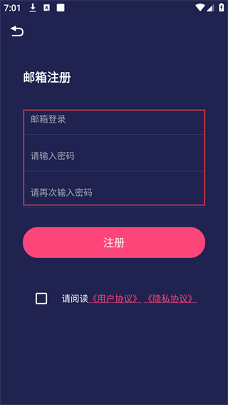 4、在注册界面,依次填写邮箱、密码(需重复输入确认),勾选协议后点击【注册】,完成账号创建。