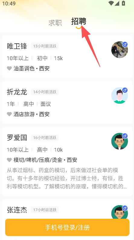 1、提供招聘板块功能,展示求职者的工作经验、薪资等基础信息,呈现西安地区的求职者资源。