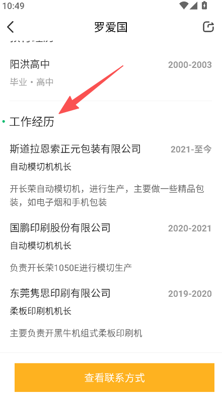 2、支持查看求职者详情,获取其工作经历内容,含任职公司、岗位及对应的工作职责等信息。