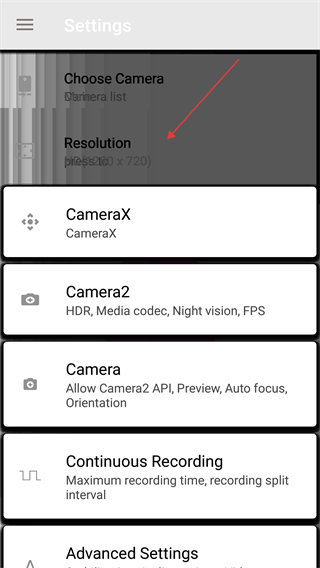 3、在设置页,点击【Resolution】选项,打开分辨率选择弹窗。
