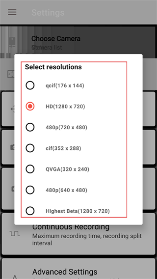 4、在分辨率列表中,选择所需分辨率(如HD、480p等),完成拍摄分辨率的配置。