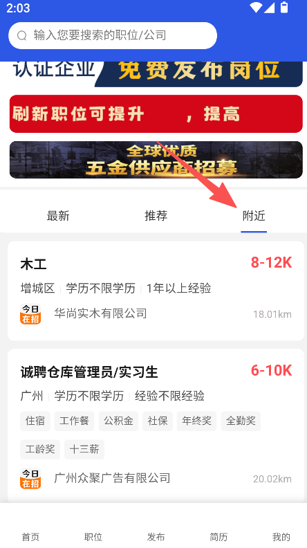 1、分最新、推荐、附近等职位板块,适配不同求职场景的岗位筛选,助力快速定位适配的招聘信息。