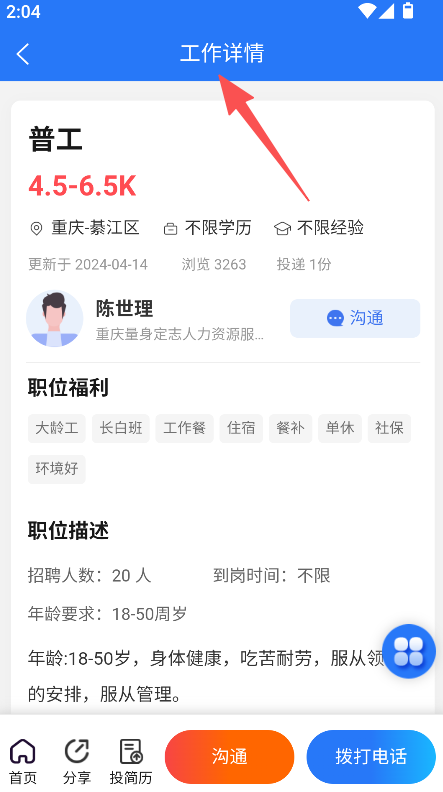 3、支持查看工作详情,获取职位福利、描述,点击沟通或投简历完成求职互动操作。