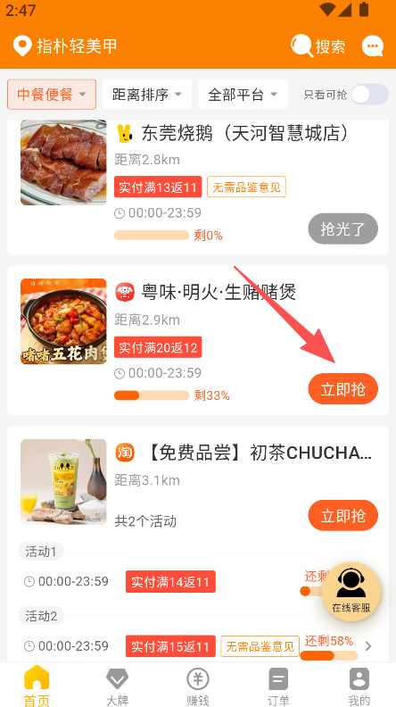 3、提供立即抢操作,点击对应店铺的立即抢按钮,完成餐饮优惠活动的参与操作。