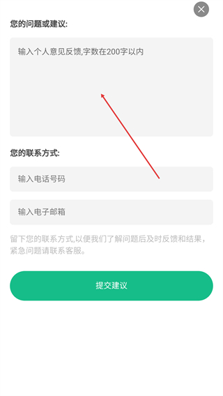 4、在意见反馈页,输入问题建议与联系方式,完成后点击【提交建议】即可反馈。