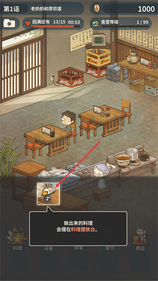 1、当有客人到来时,点击底部【料理】按钮,进入料理选择界面,准备制作对应餐食,同时可查看【食堂等级】等信息。