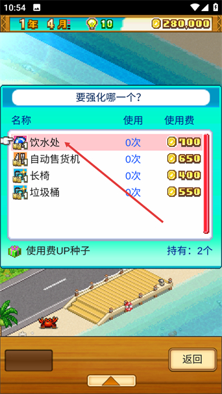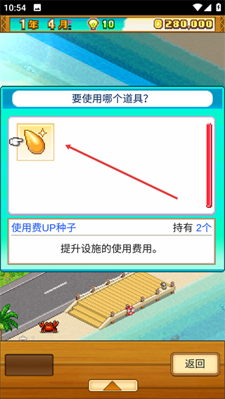 2、在道具选择界面,选中【使用费UP种子】,该道具可提升设施的使用费用,当前持有2个,选择后进入设施强化环节。