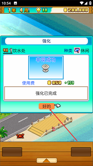 4、设施强化成功后,会显示【非常成功】的提示,对应设施使用费提升,点击【好的】按钮可关闭提示并返回主界面。