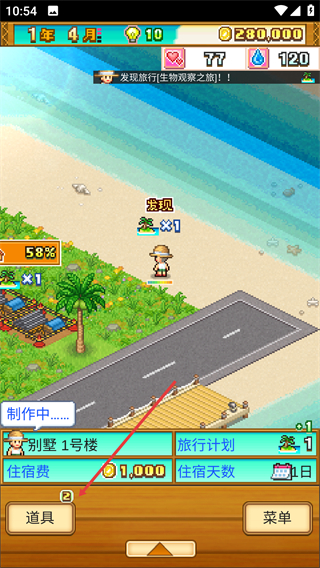 1、界面显示设施制作中,点击底部【道具】按钮,可打开道具列表,选择对应道具来强化设施,助力提升收益。