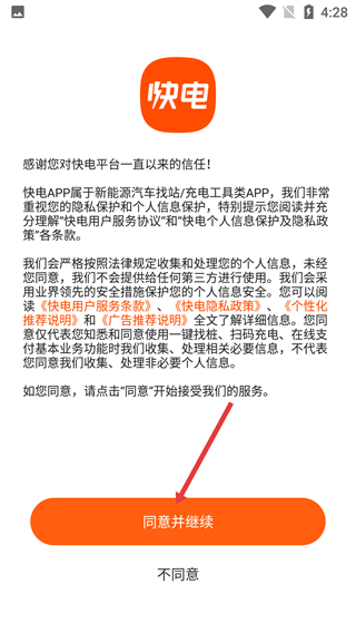 1、在快电APP的用户协议页面,点击【同意并继续】按钮,即可完成协议确认并进入应用的主界面。