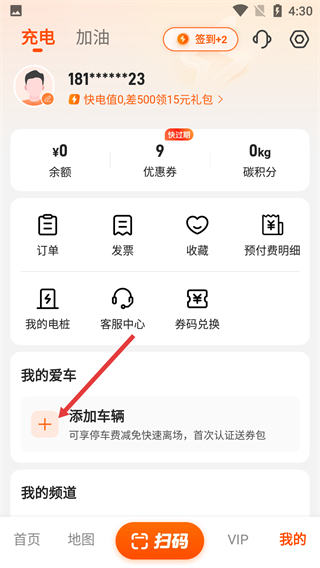 2、在快电APP主界面,点击底部导航栏的【我的】选项,可进入个人中心页面,查看各类功能入口。