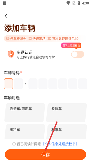 4、在添加车辆页面,填写【车牌号码】并选好车辆用途后,勾选协议再点击【保存】按钮,即可完成车辆添加操作。