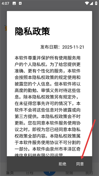 1、在隐私政策页面,点击【同意】按钮,即可确认协议并进入应用的功能界面,开启后续操作。