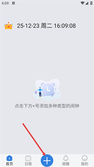 2、在应用首页,点击底部中间的【+】按钮,可进入闹钟类型的选择页面,准备进行闹钟添加操作。
