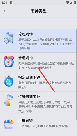 3、进入闹钟类型选择页面后,可选择【轮班闹钟】【普通闹钟】等类别,按需挑选适配自身需求的闹钟类型。