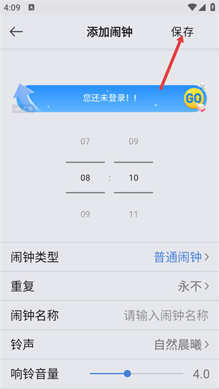 4、在添加闹钟页面,设置好时间、类型等信息后,点击右上角【保存】按钮,即可完成该闹钟的添加流程。