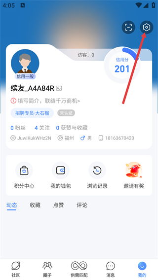 2、进入个人页面后,点击右上角的设置图标,进入包含多项配置选项的设置管理页面。