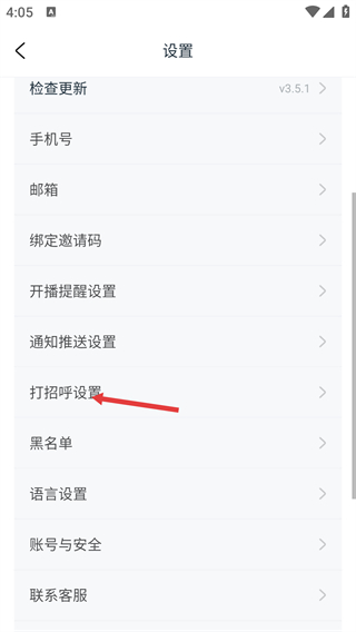 3、在设置页面中,找到【打招呼设置】选项并点击,进入对应的打招呼内容配置操作界面。