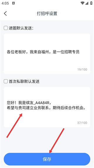 4、在打招呼设置页面,配置进圈-首次私聊的默认发送内容后,点击【保存】完成该功能的设置。