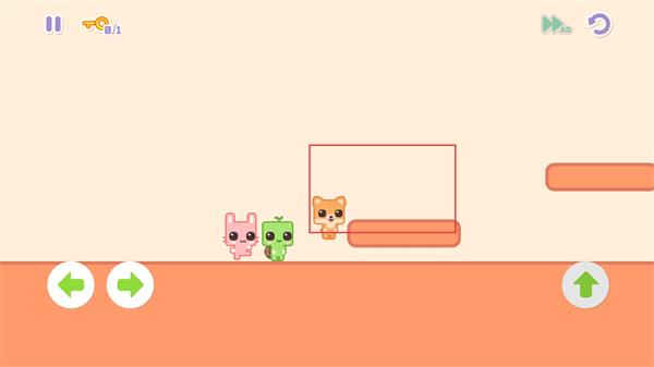 1、操作【→】按钮,控制三只小动物向右移动,靠近场景中的平台类机关道具。